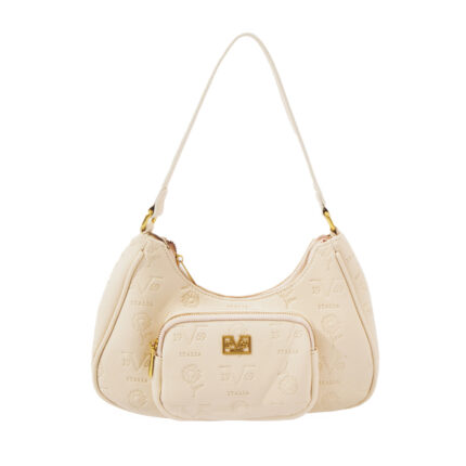 Τσάντα ώμου με υφασμάτινα λουριά και έπιπλεον αποσπώμενο και ρυθμιζόμενο υφασμάτινο ιμάντα, το οποίο το βοθάει να γίνει τσάντα χιαστί. Διαθέτει δύο βοηθητικές θήκες μπροστά, η μία με φερμουάρ και η άλλη με μαγνητικά κλιπ, καθώς και δύο στο πλάι με φερμουάρ. Στο εσωτερικό της διαθέτει μία βοηθητική θήκη. Είναι από συνθετικό αδιάβροχο ύφασμα με ασημί λεπτομέρειες και επιπλέον κρεμαστό αξεσουάρ.