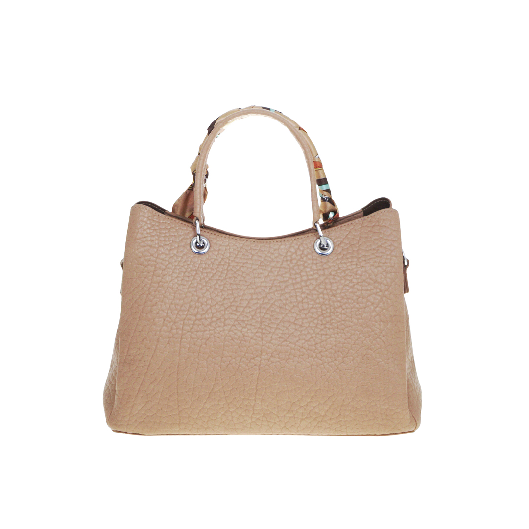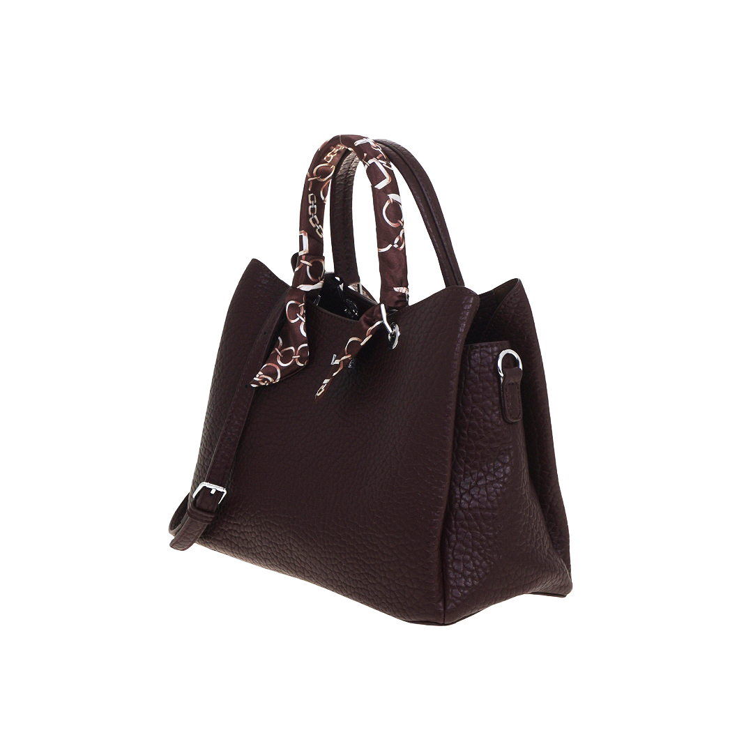 Γυναικεία τσάντα χειρός με δερματίνι χερούλια και επιπλέον αποσπώμενο και ρυθμιζόμενο δερματίνι λουρί. Ο κύριος χώρος της τσάντας χωρίζεται σε τρεις θέσεις-θήκες από τις οποίες η μία κλείνει με φερμουάρ και οι άλλες δύο με μαγνητικό κλίπ. Είναι από οικολογικό συνθετικό δέρμα με ασημί λεπτομέρειες.